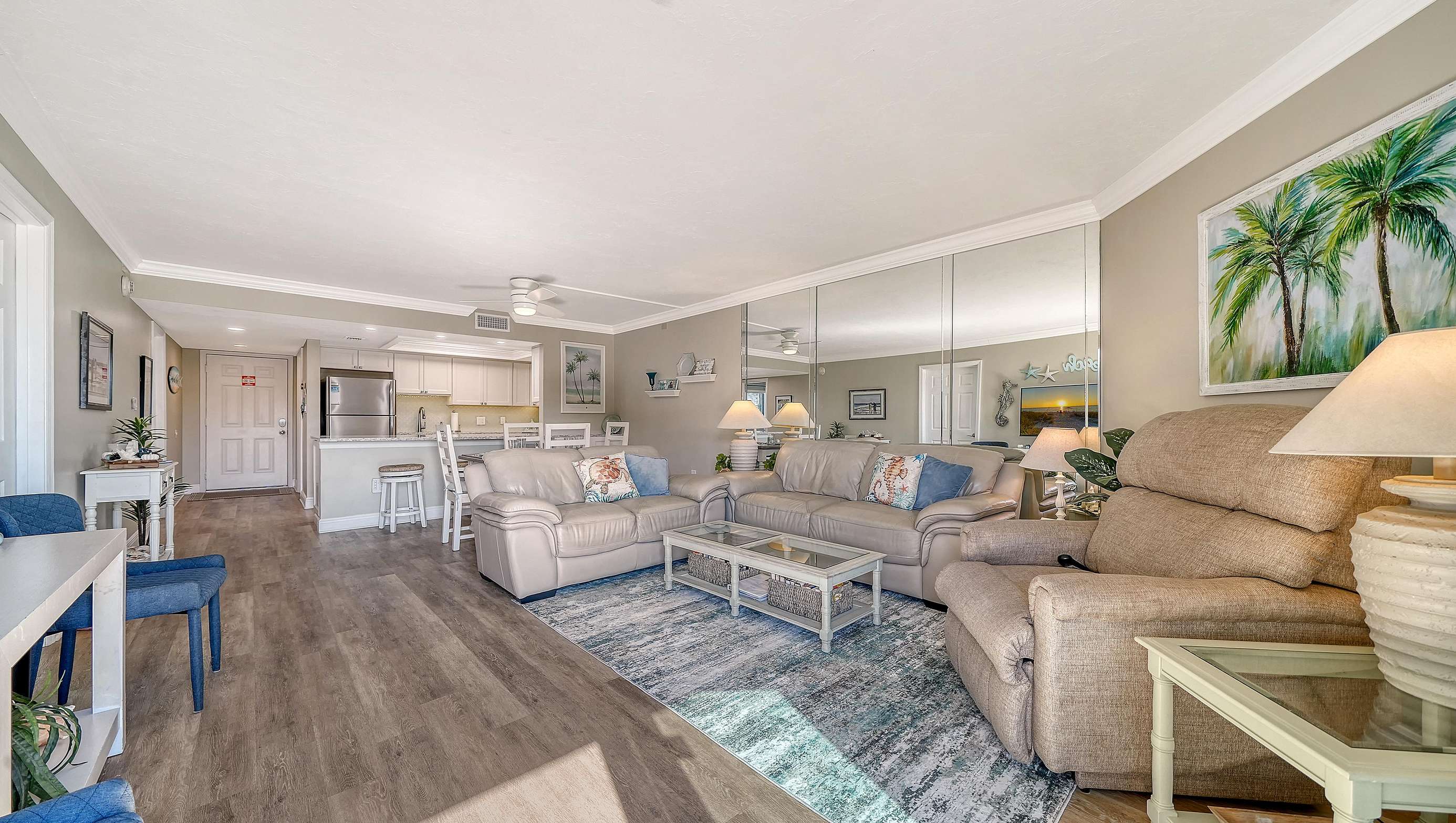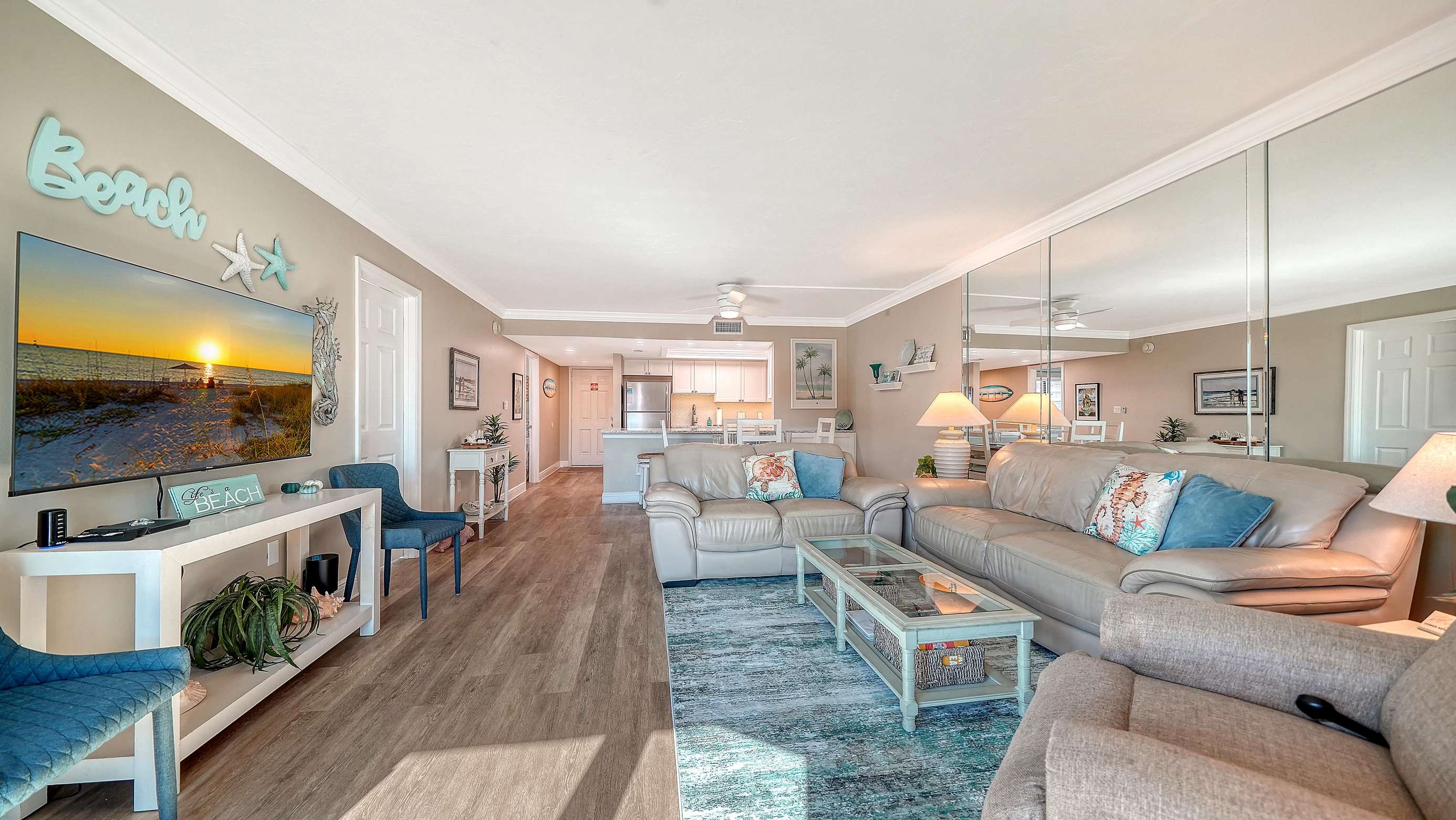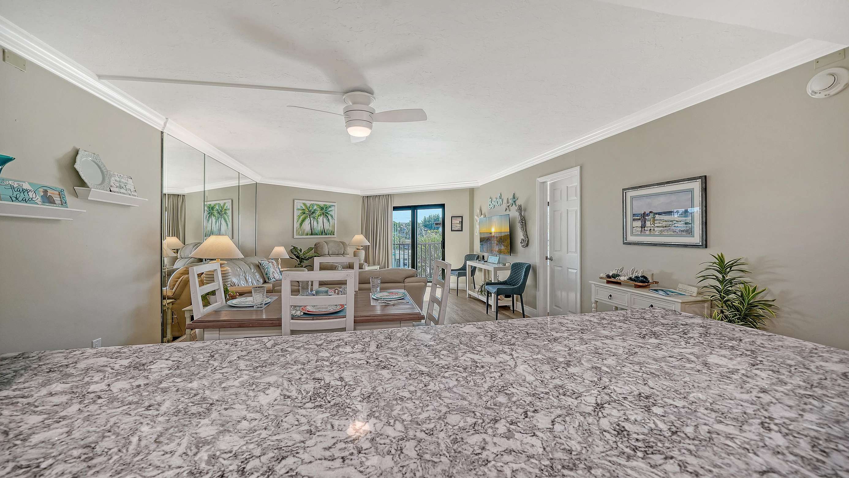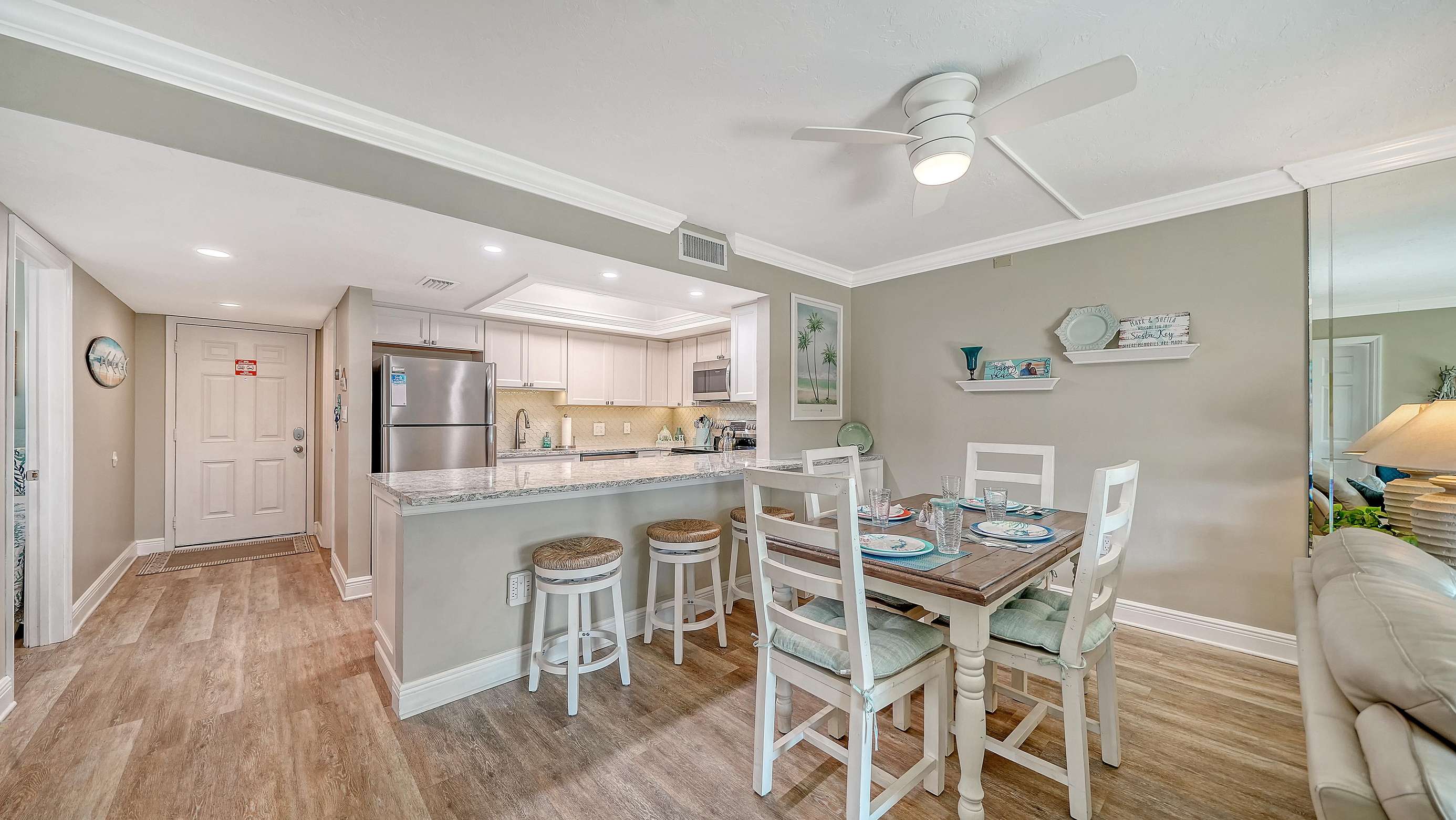 Spend your vacation in this beautifully remodeled and updated 2 BR/2 BA condo with open floor plan. It is tastefully decorated with a beachy driftwood feel located on the gorgeous white quartz sands of Siesta Key’s Crescent Beach, and it’s only 11 miles from Sarasota International Airport. Steps away from the south village where you will find several delicious restaurants, a grocery store, unique shops, and fun nightlife.