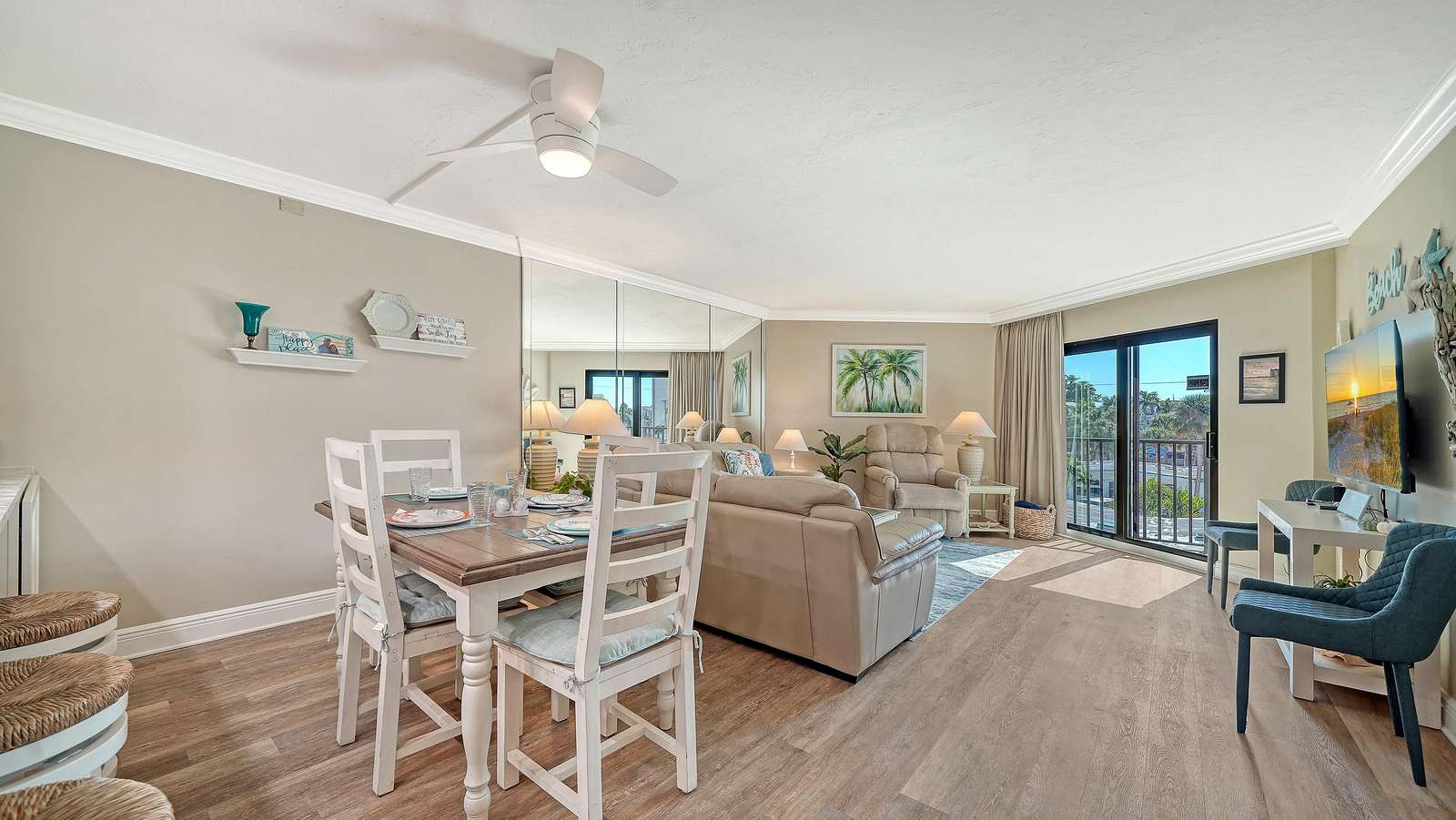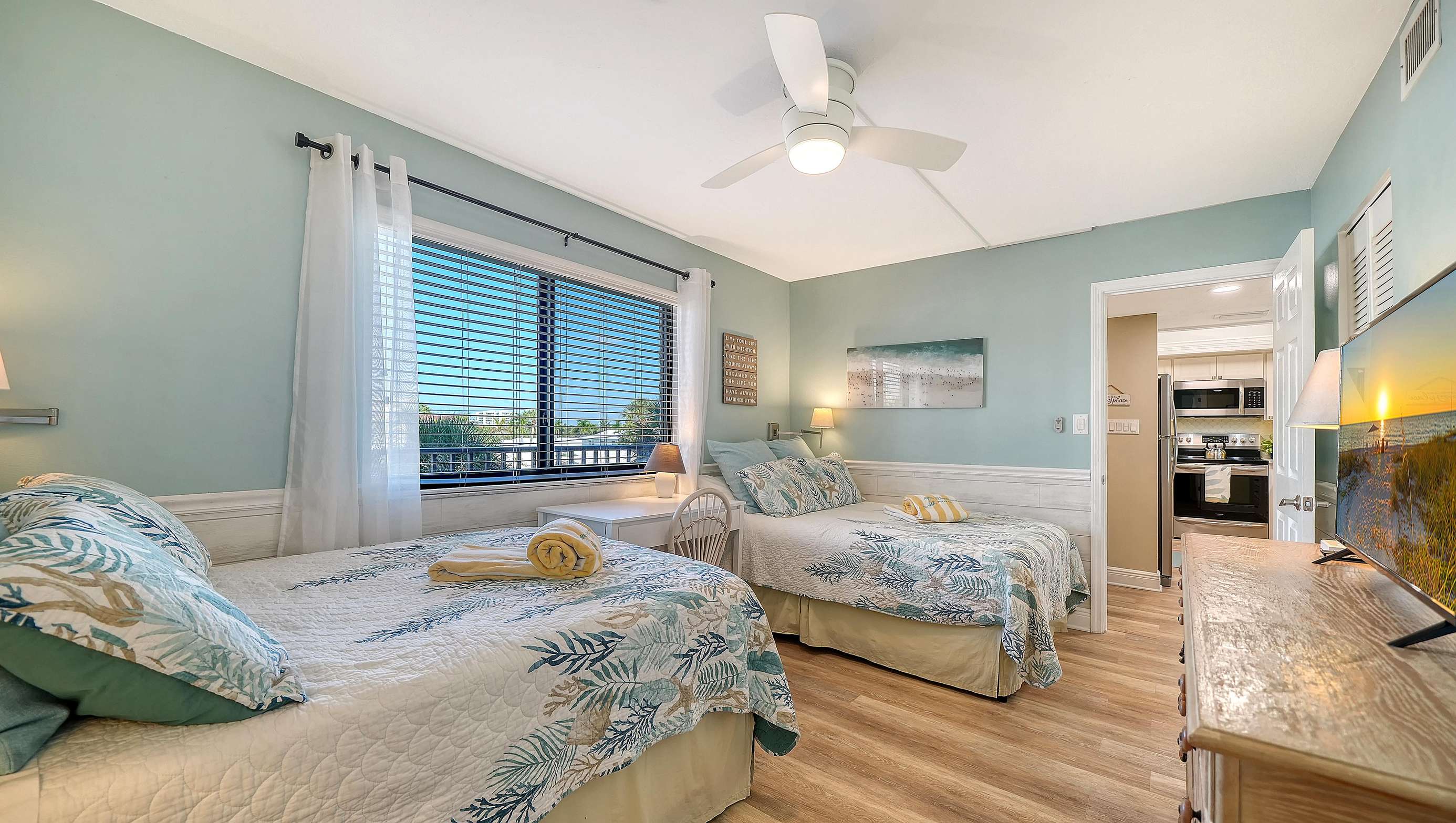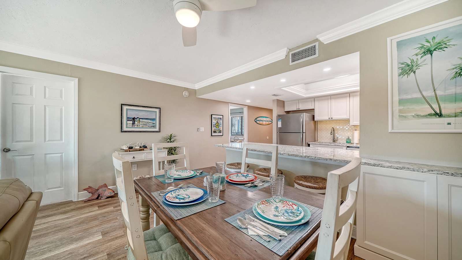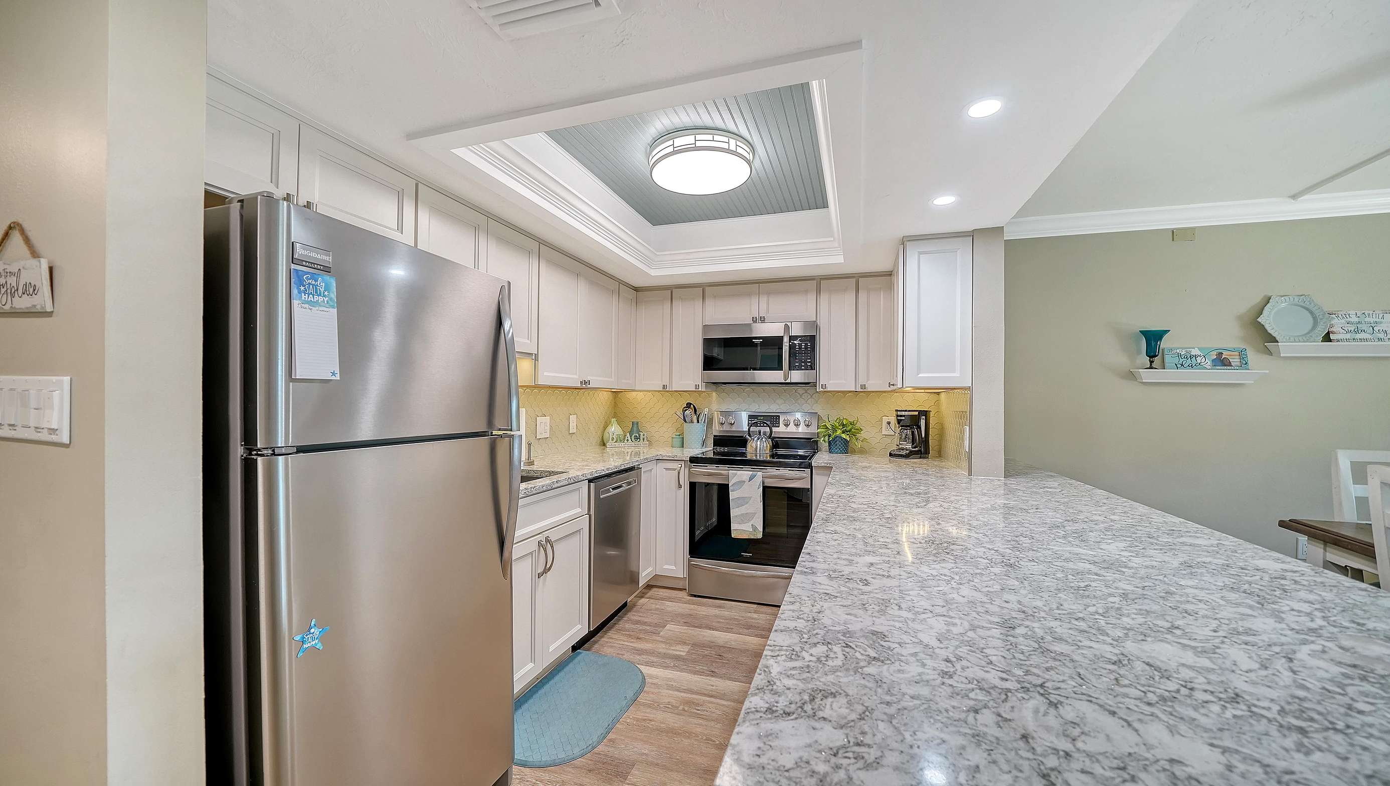 Spend your vacation in this beautifully remodeled and updated 2 BR/2 BA condo with open floor plan. It is tastefully decorated with a beachy driftwood feel located on the gorgeous white quartz sands of Siesta Key’s Crescent Beach, and it’s only 11 miles from Sarasota International Airport. Steps away from the south village where you will find several delicious restaurants, a grocery store, unique shops, and fun nightlife.
