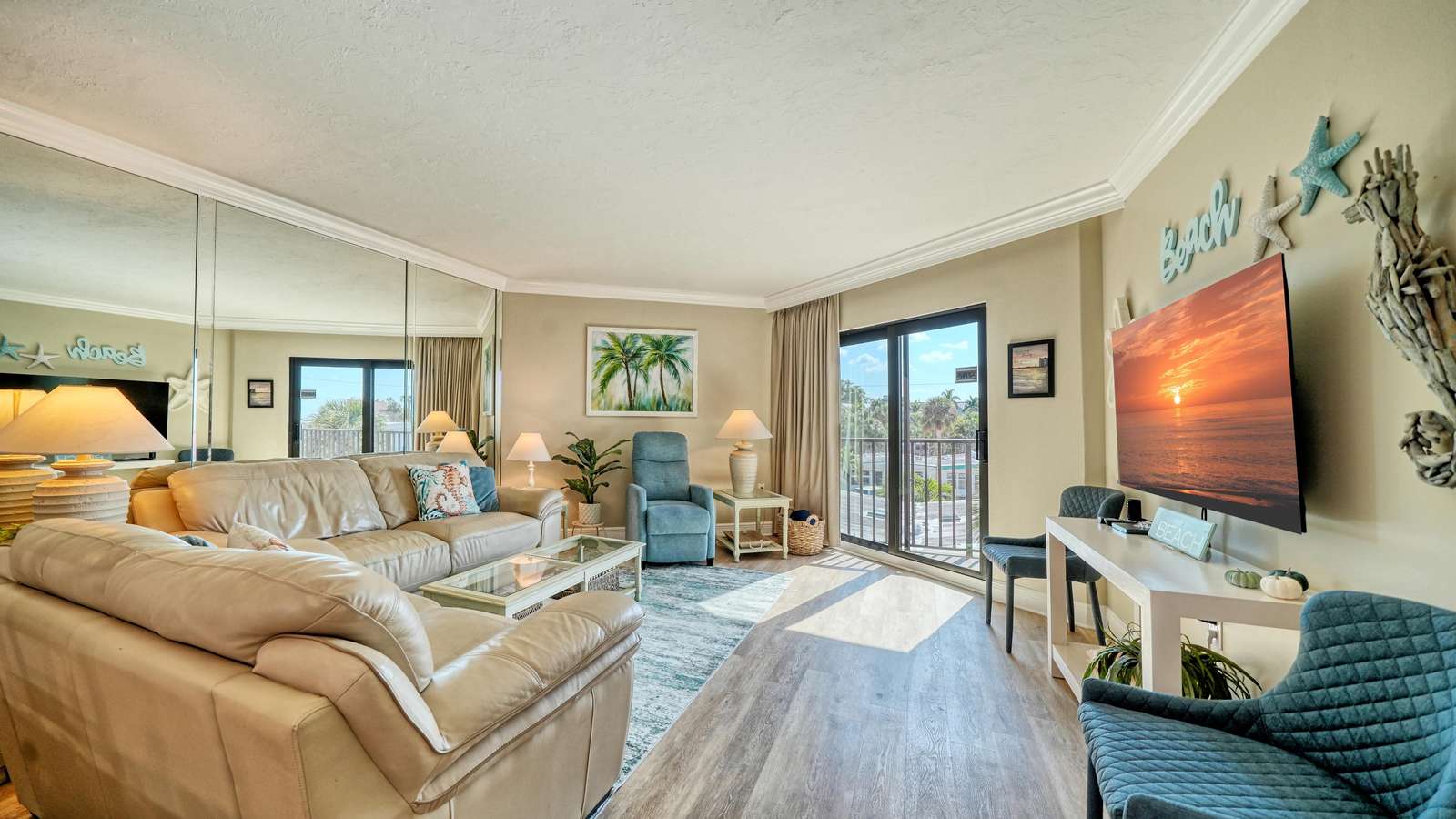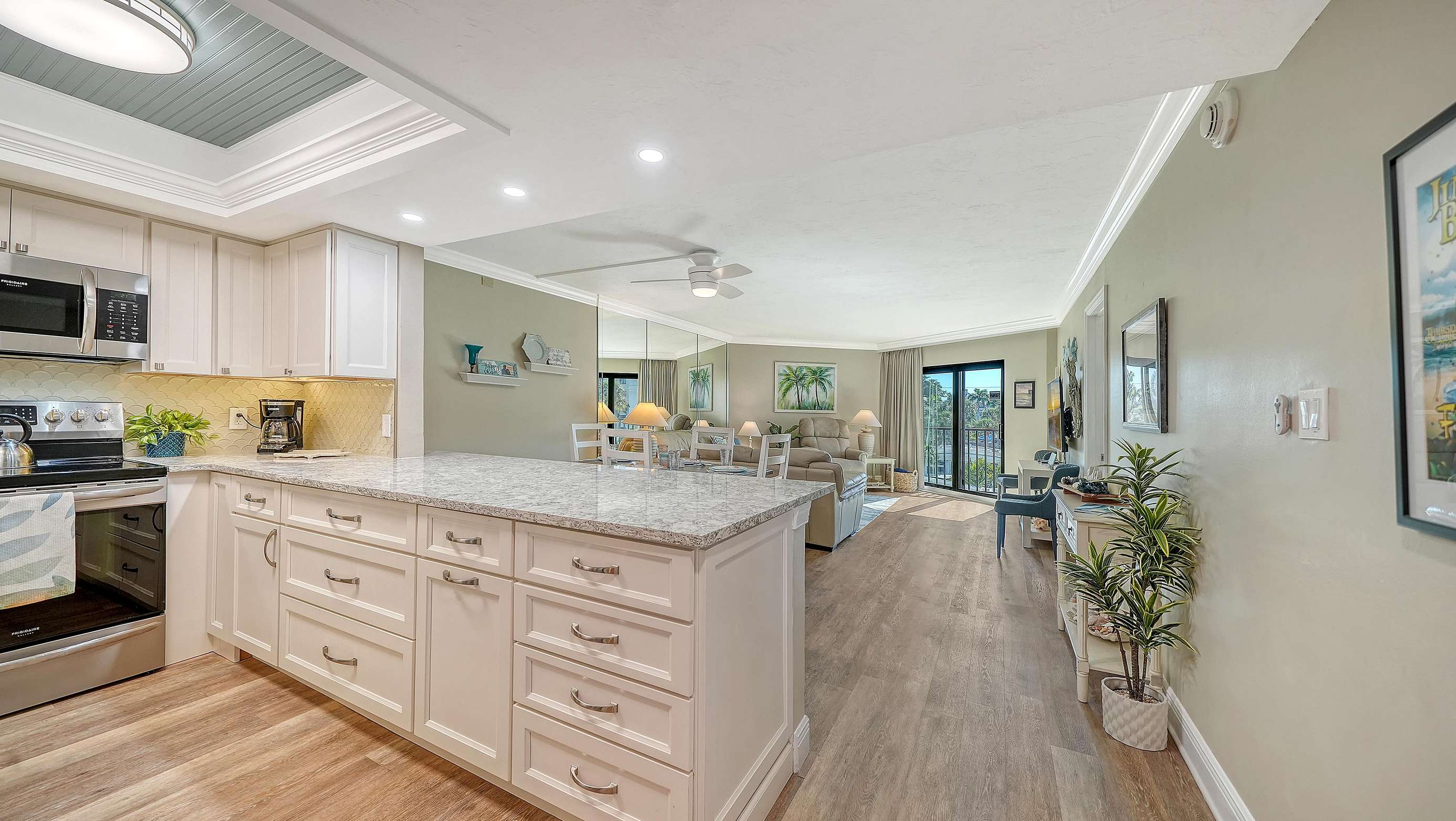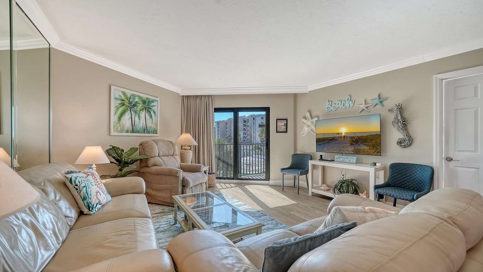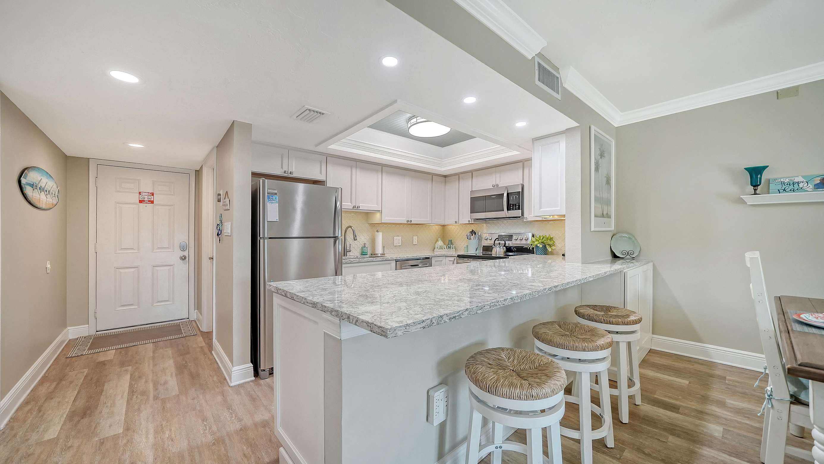The light and bright living room is complete with ample seating, comfortable leather couches, a recliner, and also includes a new 55” SMART TV. The newly remodeled and well stocked kitchen has beautiful quartz countertops, glass backsplash, new white cabinetry, and under the counter lighting for ambiance. The large master includes a king bed (new 2025) with en-suite walk in shower equipped with grab bars. The 2nd bedroom includes 2 double beds with a tub/shower combo. Both bedrooms have flat screens SMART TVs, HD cable, and secured wireless internet. Washer/dryer (new May 2025) in unit located in a separate utility room. This unit is tastefully decorated with 2 new sliders leading to a balcony off of the living room and the master bedroom. Enjoy and relax with books, games, puzzles, beach toys and an umbrella for your convenience. Assigned Parking Space but handicapped parking is also available upon request.