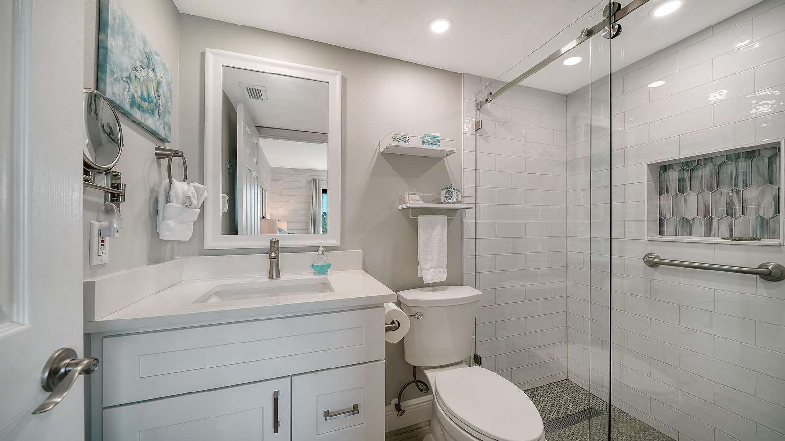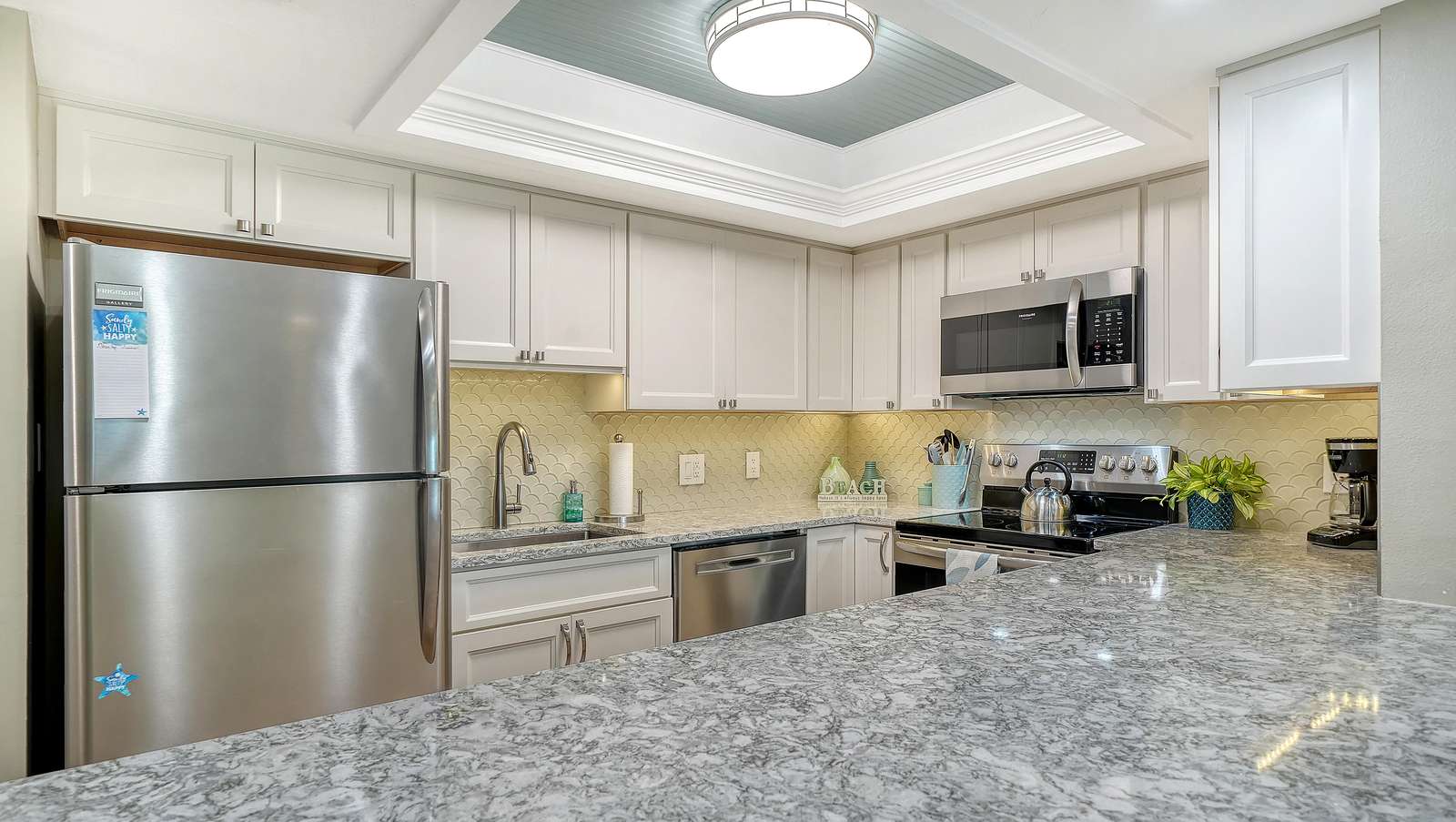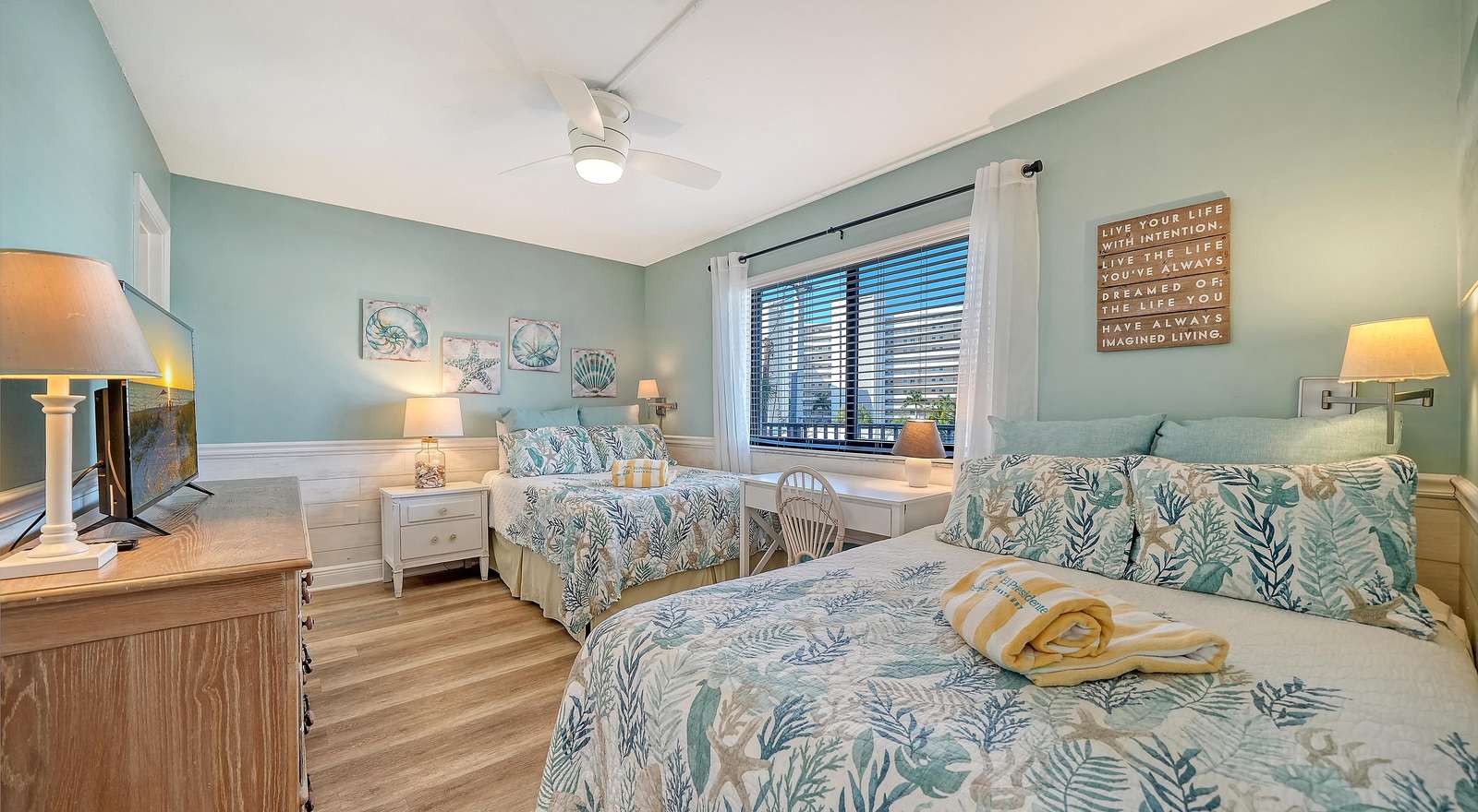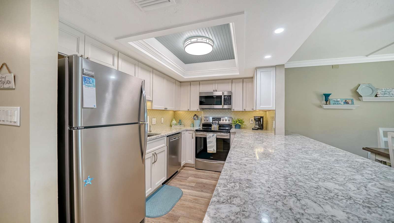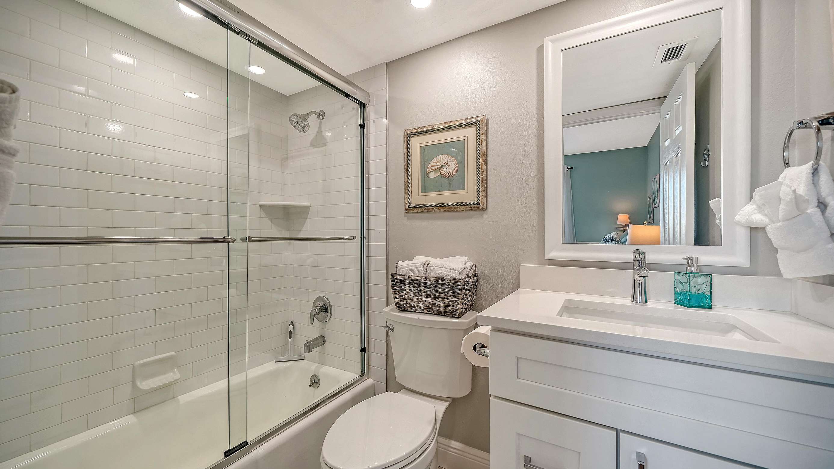 The light and bright living room is complete with ample seating, comfortable leather couches, a recliner, and also includes a new 55” SMART TV. The newly remodeled and well stocked kitchen has beautiful quartz countertops, glass backsplash, new white cabinetry, and under the counter lighting for ambiance. The large master includes a king bed (new 2025) with en-suite walk in shower equipped with grab bars. The 2nd bedroom includes 2 double beds with a tub/shower combo. Both bedrooms have flat screens SMART TVs, HD cable, and secured wireless internet. Washer/dryer (new May 2025) in unit located in a separate utility room. This unit is tastefully decorated with 2 new sliders leading to a balcony off of the living room and the master bedroom. Enjoy and relax with books, games, puzzles, beach toys and an umbrella for your convenience. Assigned Parking Space but handicapped parking is also available upon request.