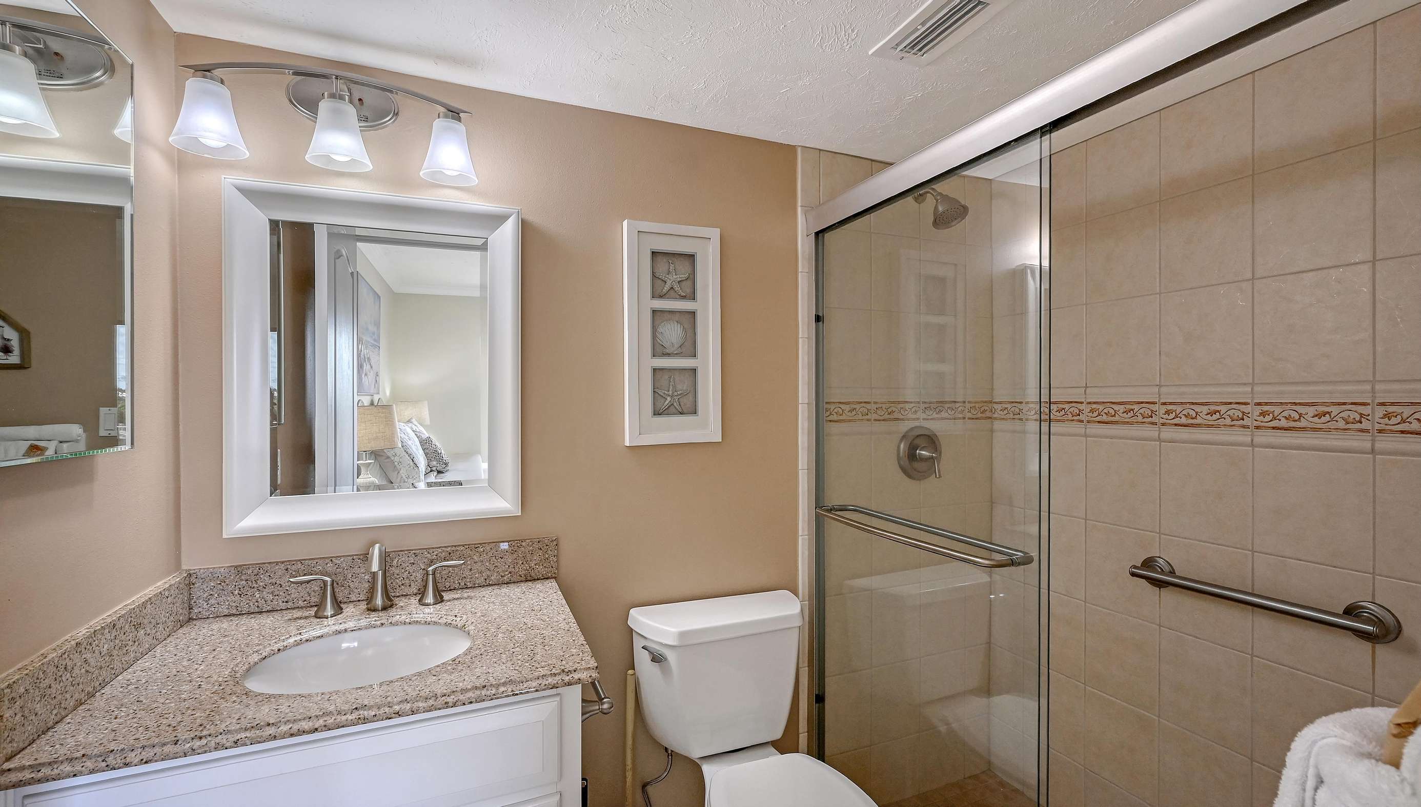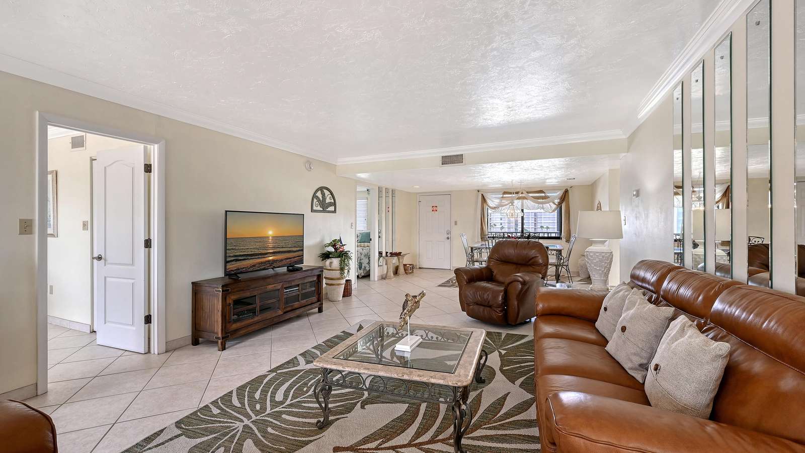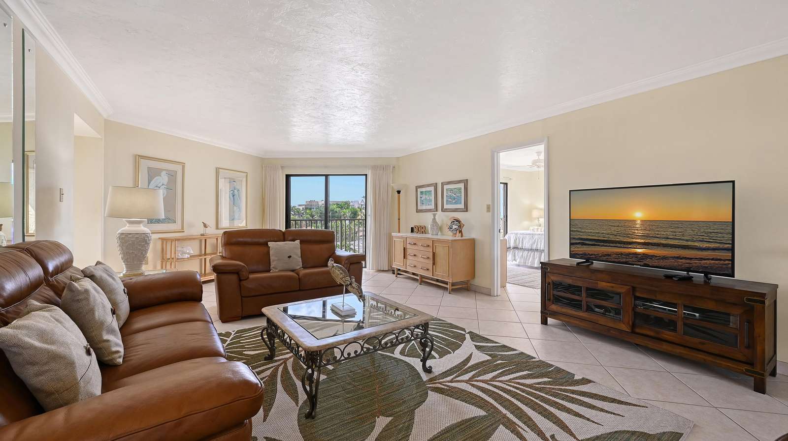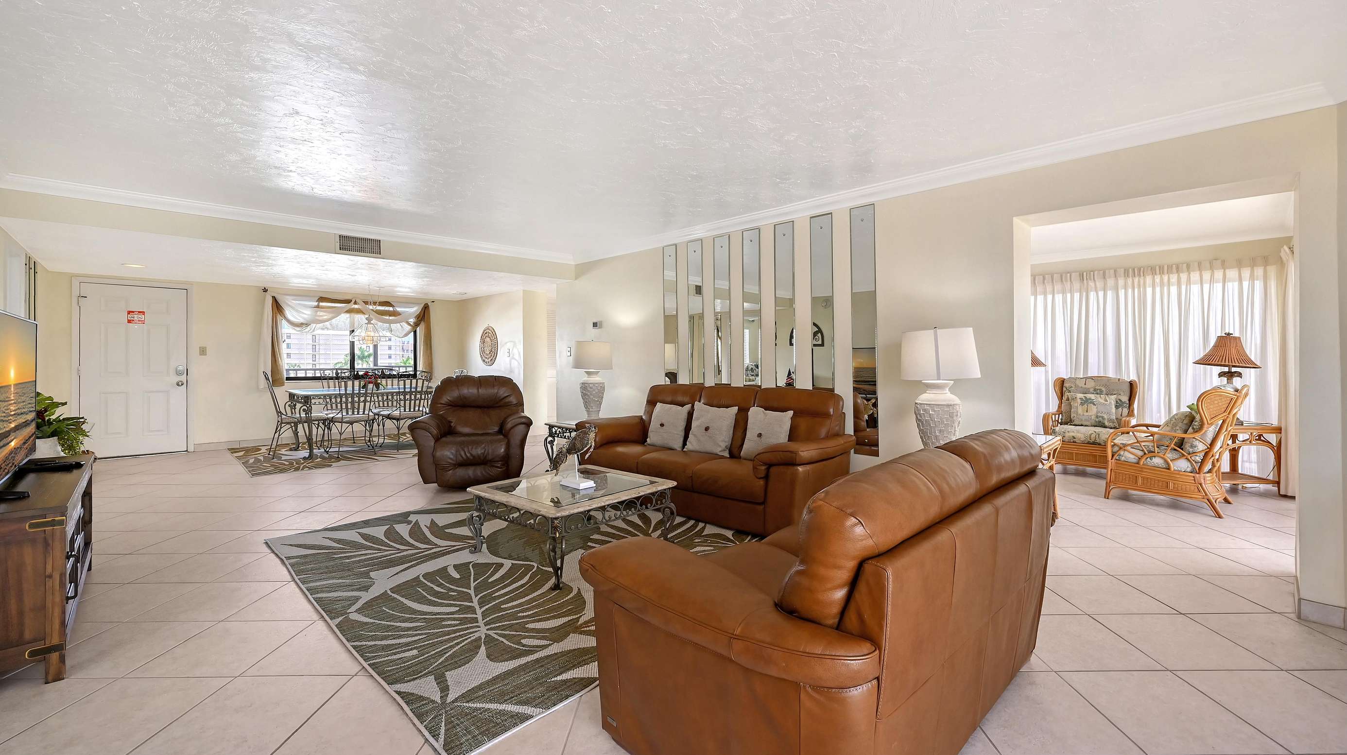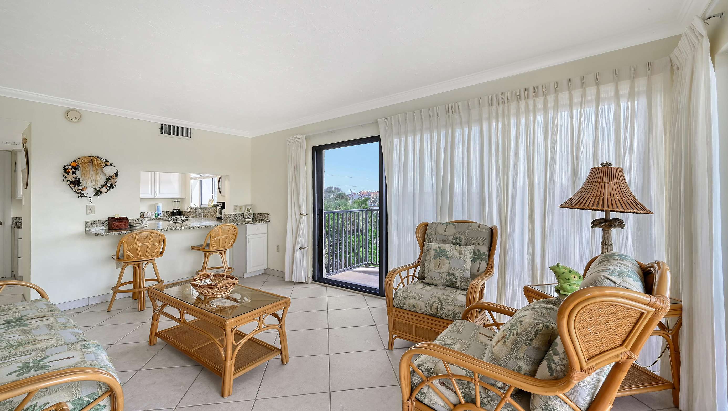 Welcome to our "hidden gem" The El Presidente Condominium complex located on Siesta Key's Crescent Beach. In this private gated, direct beach access property, you can enjoy your vacation with all the amenities of home. This third-floor end unit is an 1840 square foot spacious two-bedroom Diplomat with a bonus sunroom. Three balconies give you bird's eye views of the pickleball/tennis courts and beach horizon. Unit 301 has a fresh calming vibe, spacious enough for 6 guests. The Primary bedroom has a king-sized bed, smart tv, walk in closet, and a large, tiled shower with grab bars. The guest bedroom has two queen-sized beds, smart tv, walk in closet and tiled shower with grab bars. The open floorplan of the living and dining rooms provide a relaxing getaway for post beach gatherings, with comfortable leather seating, smart tv and dining area that seats six. A fully equipped kitchen includes blender, coffee maker, dishwasher, microwave and cookware for your convenience. The kitchen and sunroom are connected by a pass-through breakfast bar providing a great entertainment space for on-the-go meals and cocktails. The sunroom is furnished with a queen-sized sofa bed and comfortable seating area. The utility room makes beach living convenient with a stackable washer/dryer and coolers for your use. Included with Unit 301 is a sheltered parking area protecting your car from the coastal sun. Check out our photos for a preview of what you can experience with your stay.